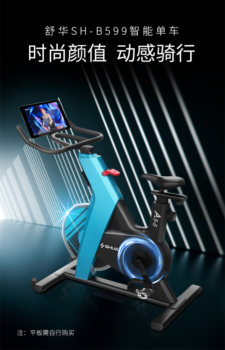v00008威尼斯推荐健身器材-舒华动感单车SH-B599采用三角形车架搭配工字底座的稳定结构设计,骑行更稳定,承重可达125kg,手动磁控阻力设计,骑行时无物理摩擦,更顺畅静音,同时无需插电,使用更便捷。13kg磁控飞轮,足量均质,保障骑行时的惯性力及动平衡,骑行劲爽。