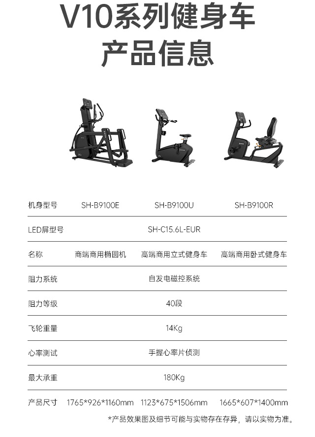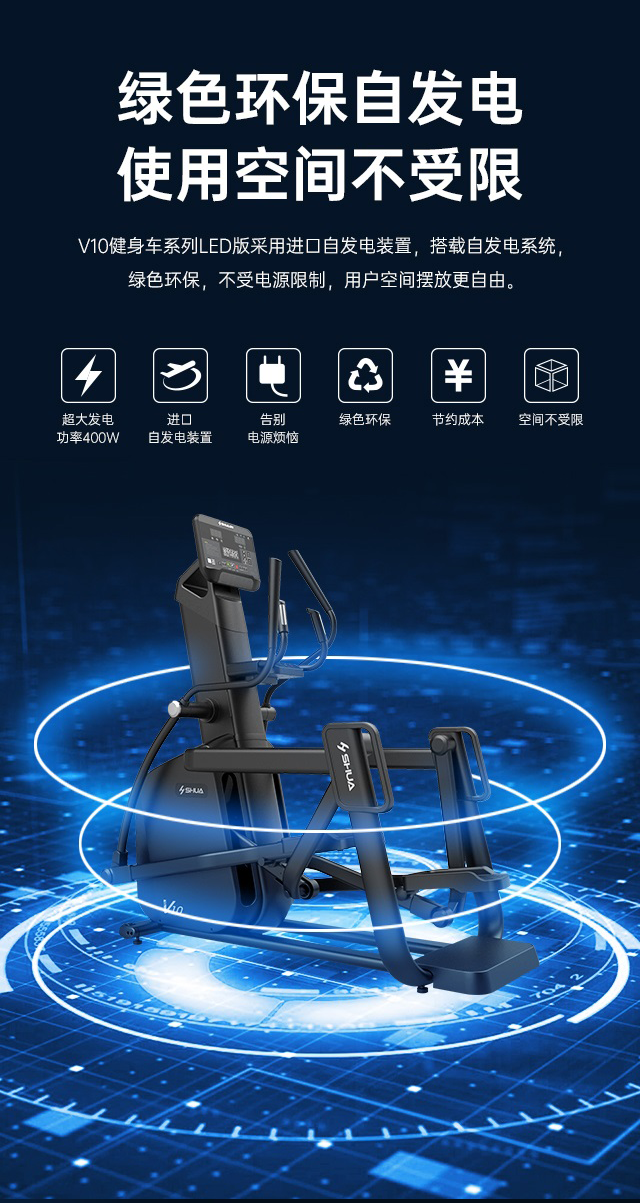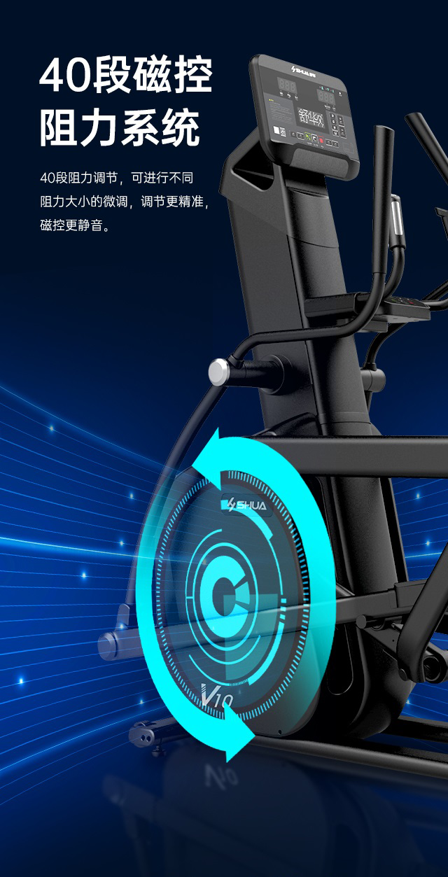 商用椭圆机SH-B9100E(LED版)采用自发电方式,磁控阻力系统的阻力系统,可以设定40段阻力段,最大使用者体重为180kg,踏步跨距可达508mm,适用于大多数人,现在v00008威尼斯旗舰店都有这一款椭圆机,欢迎前来体验试机。